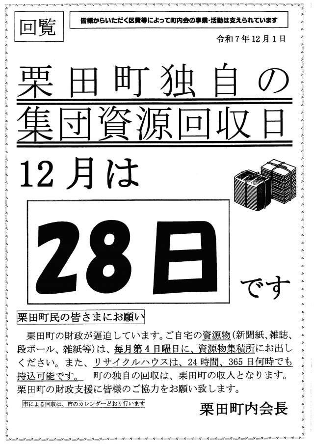 『長野市では、ごみの減量・リサイクルの推進、また市民の排出機会の増加を目的として、団体(例えば自治会、子供会、PTA等)が各家庭から出る資源物(古紙類、缶類、ビン類、布類等)を一定の日に一定の場所に集め、回収業者に引き渡すことを推奨しており、「集団資源回収」と呼んでいます。集団資源回収に対しては、それを支援するために回収量に応じて市から報奨金が交付され、団体の収入となります(栗田町内会では、財政支援につながります)。なお、この集団資源回収はあくまで町内の皆さんに協力をお願いするものであって、強要するものではありませんのでご理解ください。』 |